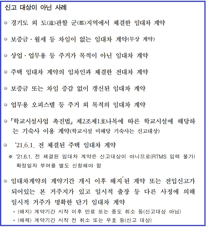 ※ 무허가, 미등기(분양권), 주거용 오피스텔, 건축물대장상 용도가 주거용이 아니더라도(근생, 공장, 숙박시설) 주거를 목적으로 한 임대차 계약이면 신고 대상임